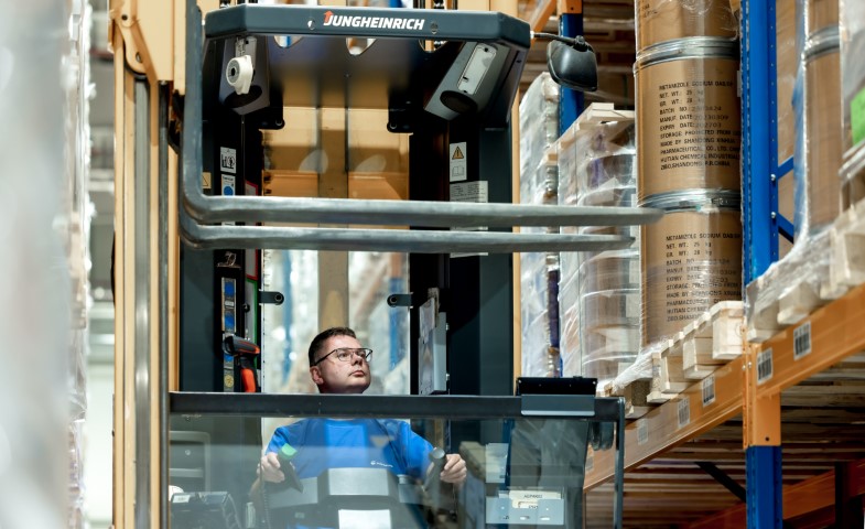 Każda hala produkcyjna (formy suche, iniekcje, API) posiada własne magazyny. To pomieszczenia ściśle kontrolowane pod względem temperatury i wilgotności, zarządzane przez pracowników działu logistyki. W produkcji farmaceutycznej, przy ogromnej ilości magazynowanych substancji oraz leków, nie może być mowy o pomyłce, dlatego nawet tak szczegółowe parametry są na bieżąco analizowane.