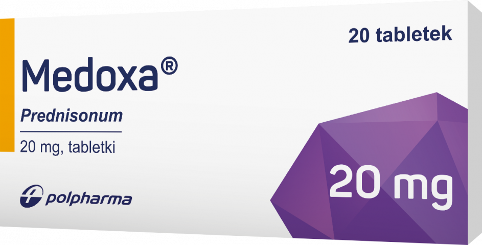 Medoxa, 1 mg, 2,5 mg, 5mg, 10 mg, 20mg, 25mg, 30mg, 50 mg tabletki. Każda tabletka zawiera odpowiednio: 1 mg, 2,5mg, 5mg, 10mg 20mg, 25mg, 30 mg,50 mg prednizonu (Prednisonum). 1 mg, 2,5 mg, 5 mg, 10 mg, 20 mg, 25 mg, 30 mg, 50 mg: Biała lub prawie biała, okrągła, dwupłaszczyznowa tabletka ze ścięciem i linią podziału na jednej stronie i wytłoczoną liczbą na drugiej stronie, odpowiednio: „1”; „2,5” ; „5”; „10”; „20”; „25”; „30”; „50”. Tabletkę można podzielić na równe dawki.