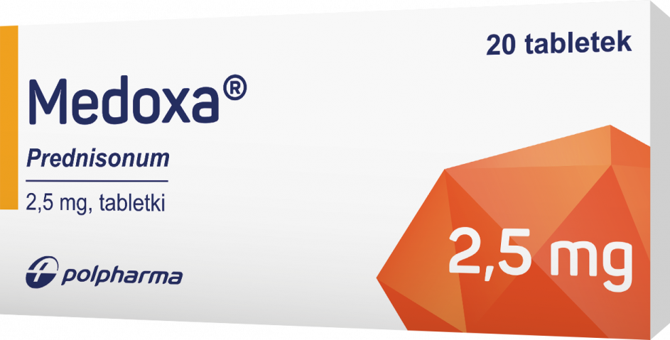 Medoxa, 1 mg, 2,5 mg, 5mg, 10 mg, 20mg, 25mg, 30mg, 50 mg tabletki. Każda tabletka zawiera odpowiednio: 1 mg, 2,5mg, 5mg, 10mg 20mg, 25mg, 30 mg,50 mg prednizonu (Prednisonum). 1 mg, 2,5 mg, 5 mg, 10 mg, 20 mg, 25 mg, 30 mg, 50 mg: Biała lub prawie biała, okrągła, dwupłaszczyznowa tabletka ze ścięciem i linią podziału na jednej stronie i wytłoczoną liczbą na drugiej stronie, odpowiednio: „1”; „2,5” ; „5”; „10”; „20”; „25”; „30”; „50”. Tabletkę można podzielić na równe dawki.