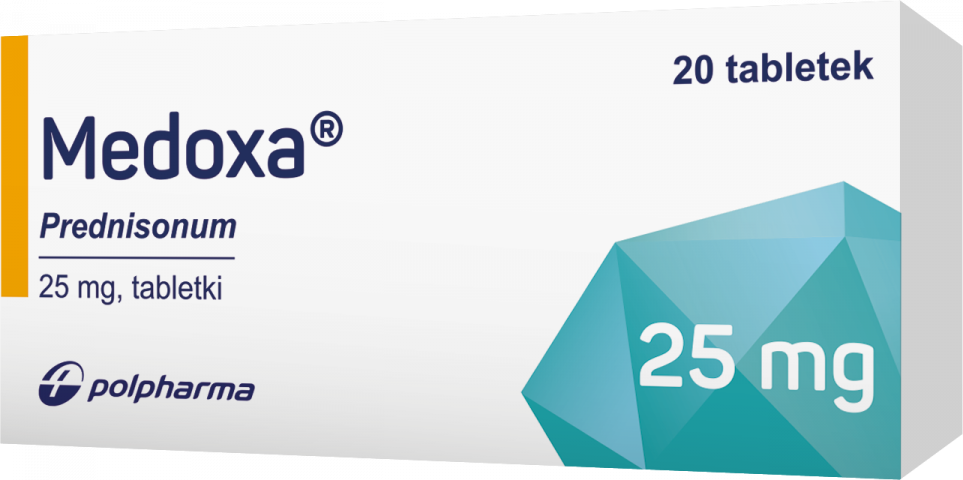 Medoxa, 1 mg, 2,5 mg, 5mg, 10 mg, 20mg, 25mg, 30mg, 50 mg tabletki. Każda tabletka zawiera odpowiednio: 1 mg, 2,5mg, 5mg, 10mg 20mg, 25mg, 30 mg,50 mg prednizonu (Prednisonum). 1 mg, 2,5 mg, 5 mg, 10 mg, 20 mg, 25 mg, 30 mg, 50 mg: Biała lub prawie biała, okrągła, dwupłaszczyznowa tabletka ze ścięciem i linią podziału na jednej stronie i wytłoczoną liczbą na drugiej stronie, odpowiednio: „1”; „2,5” ; „5”; „10”; „20”; „25”; „30”; „50”. Tabletkę można podzielić na równe dawki.