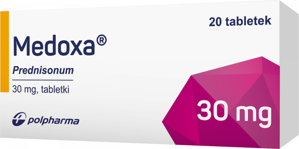 Medoxa, 1 mg, 2,5 mg, 5mg, 10 mg, 20mg, 25mg, 30mg, 50 mg tabletki. Każda tabletka zawiera odpowiednio: 1 mg, 2,5mg, 5mg, 10mg 20mg, 25mg, 30 mg,50 mg prednizonu (Prednisonum). 1 mg, 2,5 mg, 5 mg, 10 mg, 20 mg, 25 mg, 30 mg, 50 mg: Biała lub prawie biała, okrągła, dwupłaszczyznowa tabletka ze ścięciem i linią podziału na jednej stronie i wytłoczoną liczbą na drugiej stronie, odpowiednio: „1”; „2,5” ; „5”; „10”; „20”; „25”; „30”; „50”. Tabletkę można podzielić na równe dawki.